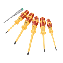 Jeu de tournevis Kraftform VDE haut de gamme. Manche Kraftform multicomposant pour un travail rapide et précis. L'empreinte Wera Black Point, associée à un procédé de trempe sophistiqué, garantit une grande longévité, une protection anticorrosion accrue et un ajustement parfait. Contrôle unitaire sous 10 000 V pour un travail en toute sécurité jusqu'à 1 000 V. Le dispositif hexagonal empêche l'outil de rouler hors du poste de travail. Avec marquage sur le manche pour trouver et ranger plus facilement l'outil. 1 testeur de tension unipolaire.