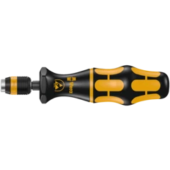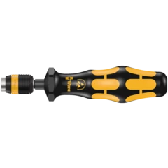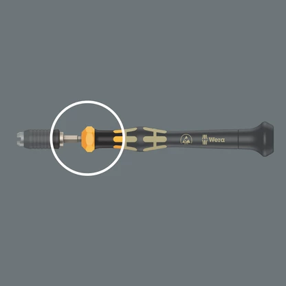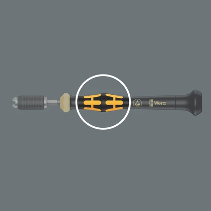 Avec couple préréglé en usine à la demande du client. Système compact de manches/lames interchangeables pour un vissage fin avec contrôle du couple. Le tournevis dynamométrique ESD Kraftform Micro est idéal pour les travaux de vissage avec contrôle du couple sur les pièces à risque électrostatique. Convient pour les embouts à emmanchement Halfmoon 4 mm (série 9) et HIOS 4 mm (série Wera 21). Protection anti-manipulation. Déclic clairement audible et perceptible dès que l'on atteint le couple réglé. Reproductibilité de la précision garantie à 100 %. Couple de desserrage manuel illimité. Résistance électrique superficielle ≤ 109 ohms pour protéger efficacement contre les décharges électrostatiques. Produit conformément à la norme DIN EN 61340-5-1. Système de manches/lames interchangeables pour un changement ultrarapide de la lame. Manche Kraftform Micro avec tête rotative et zone à rotation rapide permettant de faire tourner la lame très rapidement. Plus besoin de perdre du temps à repositionner la main. Zone de puissance incorporant des zones tendres pour la transmission de couples de serrage/desserrage élevés. Zone de précision juste au-dessus de la lame pour trouver l'angle de rotation adapté lors des travaux d'ajustement. Fixation des embouts ultrarapide : il suffit d'insérer l'embout dans l'admission, le verrouillage est automatique et l'embout ne bouge plus. Pour changer d'embout, faire coulisser la douille vers l'avant et récupérer l'embout. Douille d'actionnement libre pour guider facilement l'outil pendant le vissage. Embouts compatibles pour les vissages manuels et mécanisés avec tournevis électriques (par ex. HIOS, Delvo, Sehan). Utilisation par ex. sur les smartphones, téléphones mobiles, appareils photo et appareils électroniques ainsi que dans les laboratoires et cabinets dentaires.