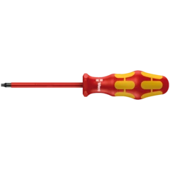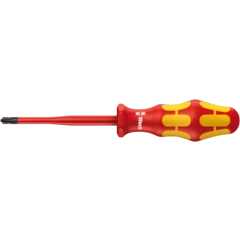 Tournevis Wera VDE (isolé) avec manche Kraftform multicomposants pour un travail rapide et en douceur : zones dures pour une haute vitesse de travail, les zones tendres garantissant quant à elles une transmission de couple élevée. Contrôle pièce à pièce à 10 000 V , pour un travail en toute sécurité sous la tension admissible de 1 000 V. Le repéreur d'outils Take it easy avec repérage couleur en fonction des pointes et des poinçons de taille, pour trouver facilement et rapidement l'outil nécessité. Le dispositif hexagonal antiroulement empêche les "échappées" importunes sur le lieu de travail.