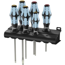 Jeu de tournevis haute qualité Kraftform Plus inox signés Wera. Les outils Wera en acier inoxydable font l'objet d'une trempe cryogénique sous vide qui leur confère les duretés et indices de résistance nécessaires aux vissages. L'usage industriel est possible sans restriction. Finition Lasertip sur certains modèles : La pointe Lasertip s'accroche dans la tête de vis et empêche le ripage. Manche Kraftform multicomposants pour un travail rapide et en douceur. Le repéreur d'outils Take it easy avec repérage couleur en fonction des pointes et des poinçons de taille, pour trouver facilement et rapidement l'outil nécessité. Le dispositif hexagonal antiroulement empêche les "échappées" importunes de l'outil sur le lieu de travail. Avec rack très pratique pour un rangement clair des tournevis.