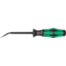 Les borniers retiennent les extrémités des fils mécaniquement. Sur les borniers à ressort, la force nécessaire est appliquée grâce à un ressort. Le ressort doit être ouvert à l’aide d’un outil pour pouvoir insérer les extrémités des fils. Les actionneurs spéciaux de Wera permettent d’actionner les borniers, même dans les recoins exigus des tableaux de distribution. Grâce à la lame courbée, il est possible d’atteindre les borniers à ressort là où les outils à lame droite sont inefficaces.