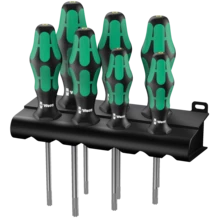 Jeu de 7 tournevis pour vis TORX®. Manche Kraftform multicomposants pour un travail rapide et en douceur. Avec fonction de retenue : la force de blocage résultant de la pression superficielle s'exerçant entre la pointe d'entraînement et le profil des vis permet le maintien sûr de ces dernières sur l'outil. Le dispositif hexagonal antiroulement empêche les "échappées" importunes de l'outil sur le lieu de travail. Avec identification du type de vis et de la taille sur le manche, pour faciliter la recherche et le tri de l'outil.