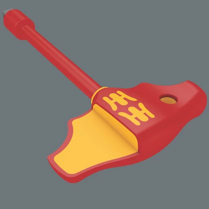 La forme du manche en T permet de transmettre des couples de serrage et de desserrage particulièrement élevés. Le manche épouse bien la forme de la paume et les doigts sont calés dans les arrondis. Ceci assure une transmission de la force optimale et ergonomique. Outil contrôlé unitairement à 10 000 V conformément à la norme IEC 60900 pour un travail en toute sécurité à la tension admissible de 1 000 V. Compatible avec les douilles VDE 3/8" des séries Wera Zyklop VDE 8740, 8760, 8767, 8790. Le manche gainé protège aussi les surfaces fragiles.