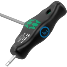 Tournevis à manche en T : la forme idéale du manche permet de transmettre des couples de serrage et de desserrage particulièrement élevés. La forme ergonomique du manche épouse bien la forme de la paume. Les doigts sont calés dans les arrondis. La main entière est en contact avec le manche et les déperditions par friction entre la main et le manche sont évitées. Traitement de surface spécial pour une protection anticorrosion accrue et un ajustement optimal dans la vis.