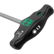 Tournevis à manche en T : la forme idéale du manche permet de transmettre des couples de serrage et de desserrage particulièrement élevés. La forme ergonomique du manche épouse bien la forme de la paume. Les doigts sont calés dans les arrondis. La main entière est en contact avec le manche et les déperditions par friction entre la main et le manche sont évitées. Traitement de surface spécial pour une protection anticorrosion accrue et un ajustement optimal dans la vis.