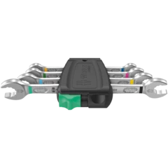 Jeu de clés mixtes à cliquet haute qualité signées Wera : Tout ce qu'une clé doit être capable de faire. Et bien davantage encore. En plus rapide, en mieux, en plus esthétique. Bref, un vrai Joker ! La nouvelle génération des clés mixtes à cliquet. Jeu de 6 pièces logées dans un robuste étui. 4 clés arborant une fourche d'un côté et un cliquet de l'autre, avec taille identique aux deux extrémités. 2 clés munies d'une fourche de taille différent de chaque côté. Pour vis à tête hexagonale / écrous hexagonaux. Avec fonction de retenue assurée par une plaque métallique implantée dans la fourche, réduisant le risque d'égarer vis et écrous. La plaque métallique interchangeable située dans la fourche bloque les vis et les écrous grâce à ses dents extra-dures et diminue le risque de ripage. La butée terminale intégrée est à même d'empêcher le glissement vertical hors de la tête de vis et permet le déploiement de couples élevés. La morphologie dodécagonale engendre une liaison géométrique intime avec la vis ou l'écrou, réduisant le risque de ripage. L'angle de reprise de 30° seulement côté fourche permet d'éviter le retournement laborieux de la clé lors du vissage. Mécanisme à cliquet à denture exceptionnellement fine (80 dents) côté œillet, offrant un maximum de souplesse même aux endroits exigus. Le forgeage à géométrie spécialement étudiée assure une transmission de couple élevée et une haute résistance à la flexion. Réalisation en acier chrome-molybdène performant, avec revêtement nickel-chrome pour une haute tenue à la corrosion. Avec repéreur d'outil Take it easy : identification des tailles par couleur.