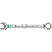 Clé mixte à cliquet haute qualité signée Wera, impériale : Tout ce qu'une clé doit être capable de faire. Et bien davantage encore. Bref, un vrai Joker ! La nouvelle génération des clés mixtes à cliquet. Pour vis à tête hexagonale / écrous hexagonaux. Avec fonction de retenue assurée par une plaque métallique implantée dans la fourche, réduisant le risque d'égarer vis et écrous. La plaque métallique interchangeable située dans la fourche bloque les vis et les écrous grâce à ses dents extra-dures et diminue le risque de ripage. La butée terminale intégrée est à même d'empêcher le glissement vertical hors de la tête de vis et permet le déploiement de couples élevés. La morphologie dodécagonale engendre une liaison géométrique intime avec la vis ou l'écrou, réduisant le risque de ripage. L'angle de reprise de 30° seulement côté fourche permet d'éviter le retournement laborieux de la clé lors du vissage. Mécanisme à cliquet à denture exceptionnellement fine (80 dents) côté œillet, offrant un maximum de souplesse même aux endroits exigus. Le forgeage à géométrie spécialement étudiée assure une transmission de couple élevée et une haute résistance à la flexion. Réalisation en acier chrome-molybdène performant, avec revêtement nickel-chrome pour une haute tenue à la corrosion. Avec repéreur d'outil Take it easy : identification des tailles par couleur.