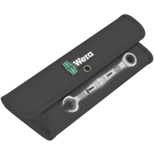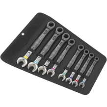 Jeu de clés mixtes à cliquet haute qualité signées Wera : Tout ce qu'une clé doit être capable de faire. Et bien davantage encore. En plus rapide, en mieux, en plus esthétique. Bref, un vrai Joker ! La nouvelle génération des clés mixtes à cliquet. Jeu de 8 clés impériales logées dans un robuste étui. Pour vis à tête hexagonale / écrous hexagonaux. Avec fonction de retenue assurée par une plaque métallique implantée dans la fourche, réduisant le risque d'égarer vis et écrous. La plaque métallique interchangeable située dans la fourche bloque les vis et les écrous grâce à ses dents extra-dures et diminue le risque de ripage. La butée terminale intégrée est à même d'empêcher le glissement vertical hors de la tête de vis et permet le déploiement de couples élevés. La morphologie dodécagonale engendre une liaison géométrique intime avec la vis ou l'écrou, réduisant le risque de ripage. L'angle de reprise de 30° seulement côté fourche permet d'éviter le retournement laborieux de la clé lors du vissage. Mécanisme à cliquet à denture exceptionnellement fine (80 dents) côté œillet, offrant un maximum de souplesse même aux endroits exigus. Le forgeage à géométrie spécialement étudiée assure une transmission de couple élevée et une haute résistance à la flexion. Réalisation en acier chrome-molybdène performant, avec revêtement nickel-chrome pour une haute tenue à la corrosion. Avec repéreur d'outil Take it easy : identification des tailles par couleur.