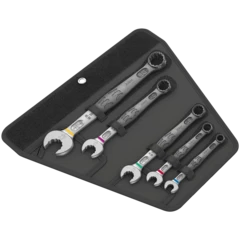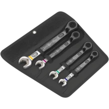 Jeu de clés mixtes à cliquet haute qualité signées Wera : Clés mixtes à cliquet Joker coudées côté cliquet et à levier d'inversion. Avec fonction de retenue assurée par une plaque métallique implantée dans la fourche, réduisant le risque d'égarer vis et écrous. La butée terminale intégrée est à même d'empêcher le glissement vertical hors de la tête de vis et permet le déploiement de couples élevés. La plaque métallique interchangeable située dans la fourche bloque les vis et les écrous grâce à ses dents extra-dures et diminue le risque de ripage. La morphologie dodécagonale engendre une liaison géométrique intime avec la vis ou l'écrou, réduisant le risque de ripage. L'angle de reprise de 30° seulement côté fourche permet d'éviter le retournement laborieux de la clé lors du vissage. e de reprise de 30° seulement côté fourche permet d'éviter le retournement laborieux de la clé lors du vissage. Mécanisme à inversion du cliquet à denture exceptionnellement fine (80 dents) côté oeillet, offrant un maximum de souplesse même aux endroits exigus. Précision du mécanisme du cliquet audible au déclic. Le robuste élément d'encliquetage en deux parties assure en outre une extrême stabilité. Côté cliquet coudé à 15° pour des travaux sûrs à couples élevés. Le forgeage à géométrie spécialement étudiée assure une transmission de couple élevée et une haute résistance à la flexion. Réalisation en acier chrome-molybdène performant, avec revêtement nickel-chrome pour une haute tenue à la corrosion. Avec repéreur d'outils Take it easy d'identification des tailles par couleur.