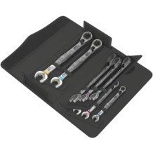 Jeu de clés mixtes à cliquet haute qualité signées Wera : Clés mixtes à cliquet Joker coudées côté cliquet et à levier d'inversion. Avec fonction de retenue assurée par une plaque métallique implantée dans la fourche, réduisant le risque d'égarer vis et écrous. La butée terminale intégrée est à même d'empêcher le glissement vertical hors de la tête de vis et permet le déploiement de couples élevés. La plaque métallique interchangeable située dans la fourche bloque les vis et les écrous grâce à ses dents extra-dures et diminue le risque de ripage. La morphologie dodécagonale engendre une liaison géométrique intime avec la vis ou l'écrou, réduisant le risque de ripage. L'angle de reprise de 30° seulement côté fourche permet d'éviter le retournement laborieux de la clé lors du vissage. e de reprise de 30° seulement côté fourche permet d'éviter le retournement laborieux de la clé lors du vissage. Mécanisme à inversion du cliquet à denture exceptionnellement fine (80 dents) côté oeillet, offrant un maximum de souplesse même aux endroits exigus. Précision du mécanisme du cliquet audible au déclic. Le robuste élément d'encliquetage en deux parties assure en outre une extrême stabilité. Côté cliquet coudé à 15° pour des travaux sûrs à couples élevés. Le forgeage à géométrie spécialement étudiée assure une transmission de couple élevée et une haute résistance à la flexion. Réalisation en acier chrome-molybdène performant, avec revêtement nickel-chrome pour une haute tenue à la corrosion. Avec repéreur d'outils Take it easy d'identification des tailles par couleur.