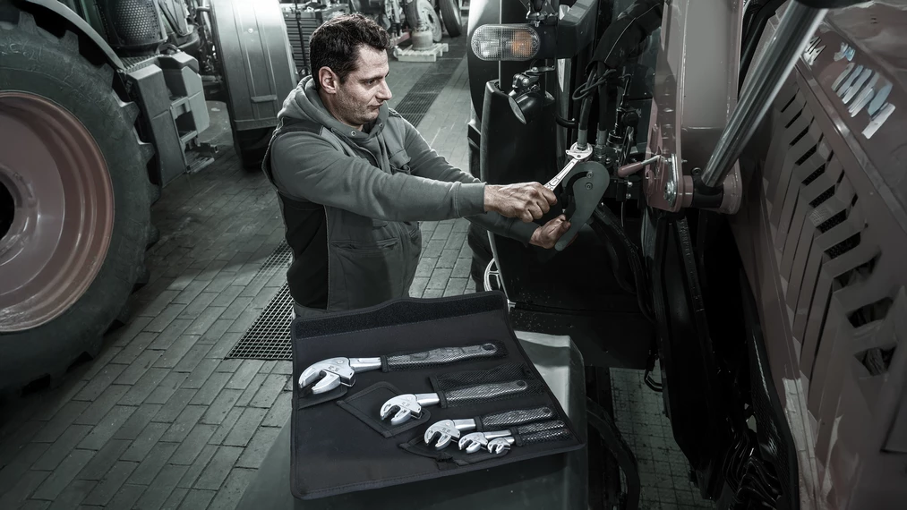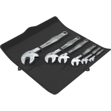 Jeu de 6 pièces. Clés à fourche auto-ajustables Joker 6004 avec fonction cliquet. Les mors parallèles réglables en continu remplacent plusieurs clés mixtes de dimension unique. Pour vis et écrous hexagonaux métriques (7,0 à 32,0 mm) et impériaux (¼" à 1 1/4"). La taille nécessaire se règle sans paliers automatiquement au contact des vis ou des écrous hexagonaux. Le mécanisme de levier intégré serre fermement la vis ou l'écrou entre les mors, ce qui réduit considérablement le risque de dérapage ou d'endommagement de la pièce. Grâce à la fonction cliquet, le vissage se fait rapidement, uniformément et sans désengagement de la clé. Les prismes permettent un angle de reprise de seulement 30°. La conception à un seul bras associée à la fonction cliquet et aux prismes permet de travailler même dans les espaces réduits. Dans un étui enroulable robuste.