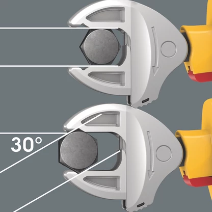 Outil contrôlé pièce à pièce à 10 000 V conformément à la norme IEC 60900 pour un travail en toute sécurité à la tension admissible de 1 000 V. La clé à fourche réglable VDE s'adapte sans paliers et automatiquement à toutes les tailles hexagonales dans la plage de dimensions indiquée, métrique et impériale. Le mécanisme de levier intégré serre fermement la vis ou l'écrou entre les mors, ce qui réduit considérablement le risque de dérapage ou d'endommagement de la pièce. La fonction cliquet permet un vissage rapide et uniforme sans désengagement de la clé. Les prismes permettent un angle de reprise de seulement 30°. La conception à une seule branche associée à la fonction cliquet et au prisme permet de travailler même dans les espaces réduits. La Joker 6004 VDE réglable dispose d'un manche agréable au toucher grâce à l'isolation plastique bicomposant. La protection antidérapage à l'avant du manche améliore la sécurité. Protection supplémentaire par la fonction coulissante permettant l'ouverture sécurisée et sans contact des mors non isolés.