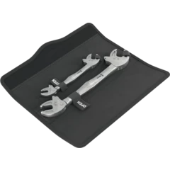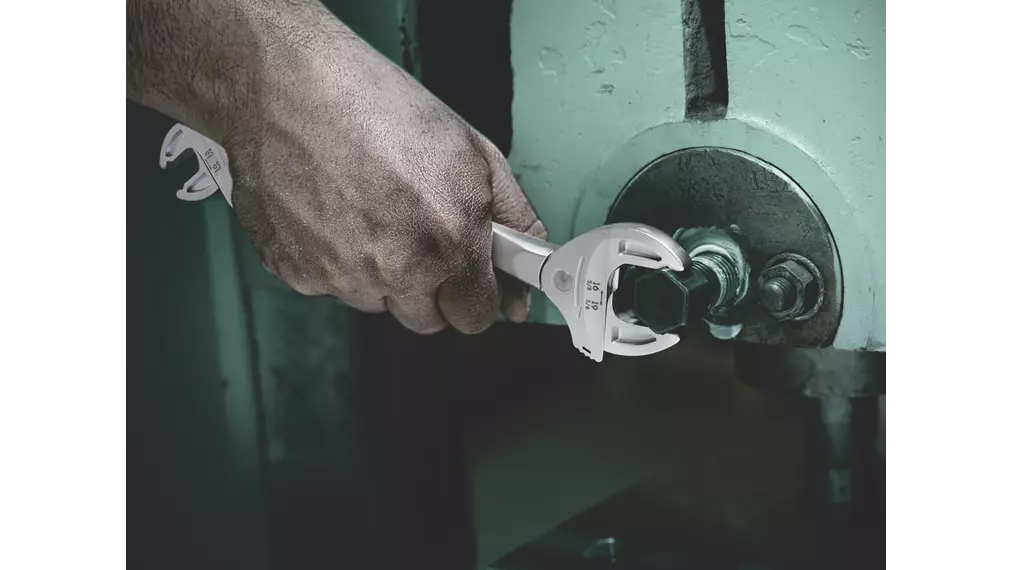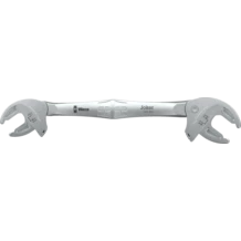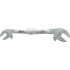 Clé double fourche auto-ajustable pour les vis à tête hexagonale et écrous hexagonaux avec largeur de clé 13-16 et 16-19 (système métrique) ou 1/2"-5/8" et 5/8"-3/4" et 7/16"-8/16" (système impérial). Les mors parallèles réglables en continu remplacent plusieurs clés mixtes de dimension unique. La taille nécessaire se règle sans paliers automatiquement au contact des vis ou des écrous hexagonaux. Le mécanisme de levier intégré serre fermement la vis ou l'écrou entre les mors, ce qui réduit considérablement le risque de dérapage ou d'endommagement de la pièce. Grâce à la fonction cliquet, le vissage se fait rapidement, uniformément et sans désengagement de la clé. Les prismes permettent un angle de reprise de seulement 30°. La fonction cliquet et les prismes permettent de travailler même dans les espaces réduits. La clé double fourche réglable Joker 6006 avec fonction cliquet est l'outil de vissage universel. Auto-ajustable. Dynamique. À cliquet.