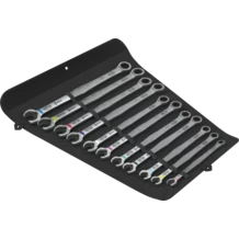 Jeu de clés mixtes à cliquet 11 pièces. L'association géniale d'un côté fourche et d'un mécanisme à cliquet côté œil en version longue. Pour les vis à tête hexagonale et écrous hexagonaux. Le levier long permet la transmission de forces élevées. La version longue facilite aussi l'accès aux vissages profondément encastrés. Avec fonction de retenue grâce à la plaque en métal de la fourche qui diminue le risque de perdre les vis ou les écrous. La plaque en métal interchangeable de la fourche munie de dents extra-dures sécurise les vis et les écrous et diminue le risque de dérapage. La butée terminale intégrée peut éviter le dérapage vertical hors de la tête de vis et permet l'application de couples élevés. La forme dodécagonale assure un ajustement parfait avec la vis ou l'écrou, ce qui diminue le risque de dérapage. Un angle de reprise de seulement 30° côté fourche évite de perdre du temps à tourner la clé pendant le vissage. Mécanisme de cliquet côté œil avec denture exceptionnellement fine de 80 dents pour plus de flexibilité dans les espaces de montage réduits. La forme forgée spéciale permet la transmission de couples élevés et offre une grande résistance à la flexion. Fabriquée en acier chrome-molybdène performant avec un revêtement nickel-chrome pour une protection anticorrosion accrue. Avec système de repérage d'outils Take it easy : code couleur en fonction des tailles et indication de la taille gravée au laser. Dans un étui enroulable robuste pour un transport facile et un rangement impeccable. 2 boucles pour accrocher l'étui, qu'il soit ouvert ou fermé.