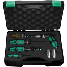 Set d'outillage, 9 pièces, pour installation et désinstallation dans les règles de l'art de systèmes de vérification de pression des pneus (Beru par ex.). Recours à la dynamométrique pour un serrage contrôlé des vis. Outils manuels équipés du manche multicomposants Kraftform permettant de travailler à vive allure tout en bénéficiant d'une ergonomie élevée. Deux outils préréglés, pour la jonction entre l'écrou-raccord et la vis et pour le vissage du corps du capteur à la valve. Un manche "pistolet" Kraftform à couple ajustable sur une plage comprise entre 4,0 et 8,8 Nm. Deux embouts TX à fonction de retenue, adaptateur pour douilles, deux douilles plus lame de maintien (adaptée à un serrage de 4,5 Nm max.). Convenant notamment aux systèmes de vérification de pression des pneus de marques Schrader®, Alligator®, VDO®.