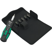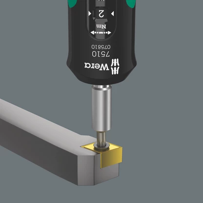 Jeu d'outils 14 pièces. Pour le serrage professionnel / l'ajustement précis professionnel ET le serrage à couple contrôlé. Mécanisme dynamométrique à débrayage sûr avec réglage droite/gauche rapide et cinq couples de serrage au choix (1,0 ; 1,5 ; 2,0 ; 2,5 ; 3,0 Nm) et une position fixe (Torque Lock) pour des couples de desserrage/serrage illimités. Manche à changement rapide pour une robustesse élevée ; pour embouts à emmanchement hexagonal 1/4". 14 embouts extra-rigides (25 mm de long). pour vis TORX PLUS®, TORX® et à six pans creux. Le jeu d'outils est spécialement conçu pour le vissage de plaquettes de coupe en carbure de tungstène. Le tournevis dynamométrique Safe-Torque Speed 7510 avec ses cinq couples au choix recommandés par les principaux fabricants d'outils en carbure de tungstène permet un serrage contrôlé des plaquettes de coupe remplaçables.
