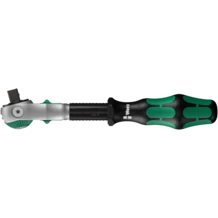 Cliquet Zyklop avec emmanchement 3/8". La denture fine avec 72 dents permet un faible angle de reprise de 5°. La tête de cliquet est librement orientable et peut être verrouillée dans chaque position grâce au bouton coulissant positionné sur les deux côtés. Possibilité de travailler sans problème avec une grande liberté de mouvement même dans les endroits très exigus ou difficiles d'accès. Les positions de blocage définies à 0°, 15° et 90° à gauche et à droite garantissent de travailler en toute sécurité et empêchent la tête de riper. En position 0° le cliquet avec adaptateur et embout s'utilise comme un tournevis conventionnel. La conception avec masse oscillante permet d'accélérer le vissage. La symétrie de rotation du manche Kraftform, associée à la bague de rotation rapide, permet une approche très rapide. Grâce à sa forme épousant parfaitement celle de la main, le manche Kraftform permet d'éviter les blessures telles qu'ampoules et callosités. Les matériaux durs entrant dans la composition du manche garantissent un repositionnement rapide de la main, sans risque de rester "collé". Les zones plus tendres "antidérapantes" permettent une transmission de forces élevées sans aucune déperdition. Pour douilles carrées 3/8" et adaptateurs 3/8" avec carré d'entraînement, avec blocage à bille.