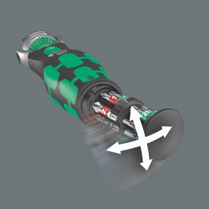 Le manche du cliquet compact Zyklop comprend un magasin captif pivotant pour 12 embouts (1/4", 25 mm de long).