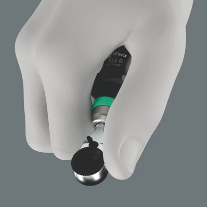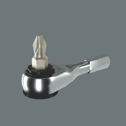 Cliquet à embout Wera pour porte-embouts avec admission 1/4". Utilisation très facile même avec une seule main lorsque la place est limitée. Acier massif forgé. Le mécanisme à fine denture de 60 dents permet un faible angle de reprise de 6° pour un travail précis. La molette permet de visser rapidement dans les endroits trop exigus pour le cliquet. Inversion gauche/droite aisée. Tête de cliquet ergonomique Pour embouts 1/4" et avec adaptateur aussi pour douilles et douilles-embouts 1/4".