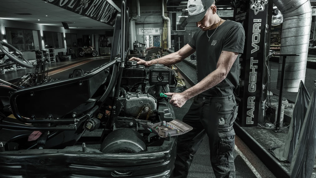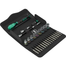Jeu avec cliquet 28 pièces, 1/4", douilles en tailles métriques. 1 cliquet Zyklop Comfort avec levier d'inversion, denture fine avec 80 dents, faible angle de reprise de seulement 4,5° ; 9 douilles Zyklop avec système de repérage d'outils Take it easy : code couleur en fonction de la taille et indication de la taille gravée au laser pour trouver rapidement l'outil nécessaire ; 1 rallonge Zyklop (150 mm de long) et bague de rotation rapide, 1 rallonge "Wobble" avec angle de basculement de 15° dans toutes les directions, 1 adaptateur à embouts (carré femelle 1/4" vers six pans creux 1/4"), 15 embouts, extra-rigides à usage universel. 1 housse textile robuste, compacte pour un rangement peu encombrant ; le matériau léger et résistant de la housse textile allège le poids du jeu, ce qui le rend idéal pour les déplacements.