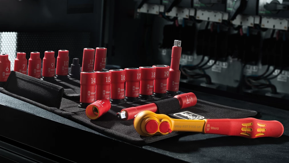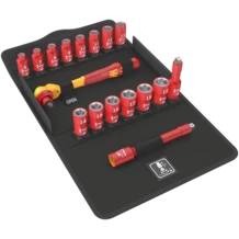 Composition ultra-compacte pour un maximum d'outils. Contrôle à 100% des cliquets, douilles et rallonges selon l'IEC 60900 sous 10.000 V pour un travail en toute sécurité jusqu'à 1.000 V. Pochette textile très résistante pour une grande durée de vie ; rangement vertical possible sur une étagère. Protection maximale par le textile et réduction du volume et du poids pour plus de mobilité. Mécanisme de rotation pour faciliter la prise et le rangement des douilles VDE.