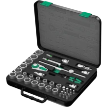 Assortiment Zyklop 38 pièces dans une robuste mallette métallique : cliquet Zyklop à emmanchement 1/2". La fine denture (72 dents) permet un faible angle de reprise de 5°. La tête du cliquet est librement orientable et peut être verrouillée en toute position grâce aux interrupteurs coulissants situés de chaque côté, ce qui permet de travailler sans problèmes et avec une grande liberté de manœuvre, même dans les endroits très exigus ou difficiles d'accès. Les positions d'arrêt définies à 0°, 15° et 90° vers la gauche et la droite garantissent un travail sûr et empêchent la tête de riper. En position 0°, le cliquet peut s'utiliser comme un tournevis classique, en combinaison avec un adaptateur et un embout. La construction en masse oscillante permet une accélération du processus de vissage. La symétrie de rotation du manche Kraftform et la douille à course libre favorisent le tortillement rapide. Grâce à sa forme parfaitement ajustée à la main, le manche Kraftform bannit les blessures telles qu'ampoules et callosités. Les matériaux durs employés permettent un repositionnement rapide de la main, sans risque pour la peau de "rester collée" au manche. Les zones plus tendres, antidérapantes, autorisent la transmission de forces élevées, sans déperdition. Pour douilles de vissage à carré 1/2" ainsi qu'adaptateurs 1/2" à emmanchement carré, avec blocage à bille. Avec 17 douilles Zyklop, 2 rallonges Zyklop à douille de rotation rapide, 1 manche transversal, 1 joint de cardan, 1 rallonge "Wobble", 1 élément de liaison avec mandrin à serrage rapide, 13 embouts. Avec système de repérage d'outil Take it easy : identification des tailles par couleur.