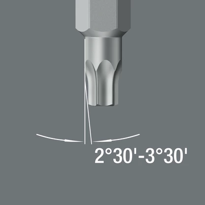 La conicité du profil TORX® offre un meilleur positionnement dans la vis. Compte tenu de la grande profondeur d’engagement, cela permet d’obtenir un effet de serrage.