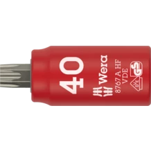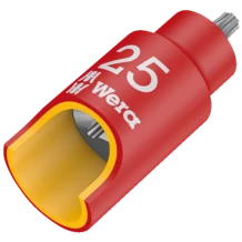 Douille-embout VDE 1/4" avec fonction de retenue pour vis TORX® pour un vissage particulièrement confortable avec un risque réduit de perdre la vis à l'approche de la pièce. Sécurité accrue grâce à l'isolation bicomposant, le cœur isolant jaune devenant visible si la couche isolante VDE externe rouge est endommagée. Outil contrôlé pièce à pièce à 10 000 V conformément à la norme IEC 60900 pour un travail en toute sécurité à la tension admissible de 1 000 V.