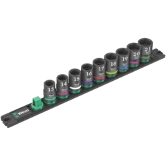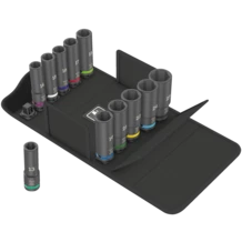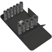 Jeu de 11 douilles Impaktor Deep pour l'utilisation avec les visseuses électriques ou pneumatiques à chocs avec emmanchement de 12,5 mm = 1/2". Version longue pour les vissages profondément encastrés et les tiges filetées en saillie. La technologie Impaktor offre des durées de vie supérieures à la moyenne, même face à des exigences extrêmes. Le profil à six pans utilisé permet la transmission de forces élevées avec une grande précision et préserve le profil. Repéreur d'outils Take it easy avec code couleur en fonction de la taille pour trouver rapidement et facilement l'outil nécessaire.