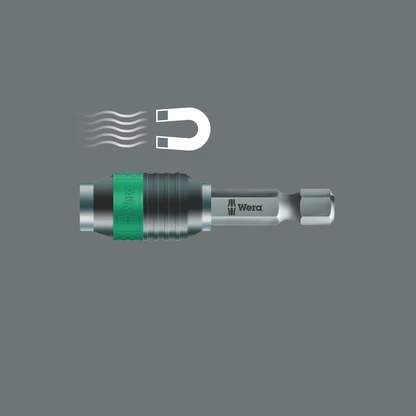 Porte-embouts universel Rapidaptor pour embouts à emmanchement hexagonal 1/4" selon DIN ISO 1173-C 6,3 et E 6,3 (ISO 1173). La technologie Rapidaptor permet l'insertion des embouts, même sans actionner la douille. Un mouvement de coulisse vers l'avant suffit à retirer l'embout. Le changement est ultrarapide, même avec une seule main. Le puissant aimant permanent permet un maintien des embouts à toute épreuve. Hexagone 1/4" pour visseuses avec admission selon DIN ISO 1173-F 6,3.