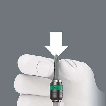 Pour échanger l’embout, il suffit de faire coulisser la douille vers l’avant : le mécanisme à ressort décolle l’embout de l’aimant et déverrouille l’outil. L’embout peut être retiré sans problèmes. Particulièrement utile: retrait des embouts même de tout petit taille sans aucun outil auxiliaire.