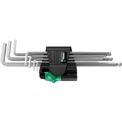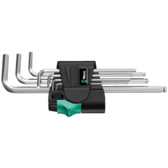 Jeu de clés mâles coudées haute qualité, pour vis six pans creux du système impérial, sous clip très pratique, réalisé dans un matériau inusable garantissant un maintien sûr et durable des clés tout en facilitant leur retrait. Clés mâles coudées à profil Hex-Plus : offre des surfaces d'appui plus vastes dans la tête de vis. L'effet d'entaille est ce faisant réduit au minimum, la destruction de la tête de la vis quasiment éliminée. La sphère terminant le bras long un travail sûr, même dans les situations de montage complexes. La finition BlackLaser assure une excellente protection des surfaces, y compris contre la corrosion, ainsi qu'une haute longévité. Accès rapide grâce à la mention de la taille portée sur la clé par gravage laser et résistant de ce fait à l'abrasion.