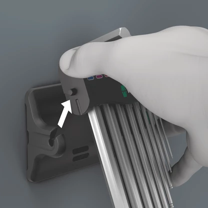 Les 9 clés coudées chromées avec Hex-Plus empêchant la déformation des vis constituent un assortiment d'outils solide pour les vis à six pans creux. Rangement pratique dans un rack à poser sur la table ou à fixer au mur. Clip intégré au rack pouvant être retiré pour les interventions mobiles. Le rack contient également un astucieux bloc de magnétisation amovible permettant de magnétiser (et démagnétiser) les vis et pointes d'outils ; il n'est donc plus nécessaire de maintenir la vis avec la deuxième main.
