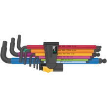 9 clés coudées avec gainage plastique (SPKL) en matériau circulaire facilitant la préhension. Doux pour les doigts, le gainage rend le travail agréable, même à basse température. Toutes les clés sont faciles à repérer grâce au code couleur et à l'indication de la taille. Le matériau inusable du clip maintient fermement les clés et facilite leur retrait. Pour les vis à six pans creux.