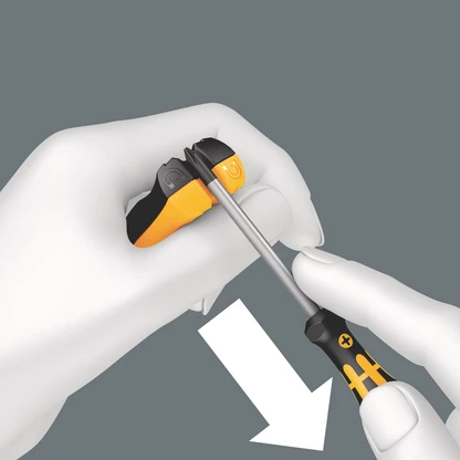 Grâce au bloc de magnétisation Wera: il suffit de glisser l’outil le long de la face positive du bloc pour magnétiser l’extrémité de la lame.