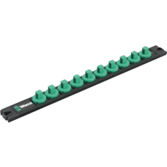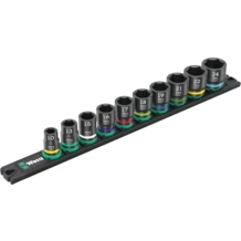 Barre magnétique avec 10 douilles Impaktor pour l'utilisation avec les visseuses électriques ou pneumatiques à choc à emmanchement 3/8". La technologie Impaktor offre des durées de vie supérieures à la moyenne, même face à des exigences extrêmes. Le profil à six pans utilisé permet la transmission de forces élevées avec une grande précision et préserve le profil. Repéreur d'outils Take it easy avec code couleur en fonction de la taille pour trouver rapidement et facilement l'outil nécessaire. La barre magnétique permet une fixation temporaire sur les surfaces métalliques et la fonction Twist to unlock le maintien et le retrait en toute sécurité des douilles.