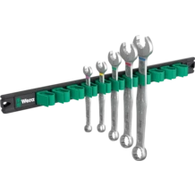 Jeu de clés mixtes, 5 pièces, tailles métriques ; sur barre d'attache. La Joker 6003 double les points d'ancrage avec son côté fourche coudé à 7,5° et sa forme dodécagonale. Lors de la rotation répétée à 180° de la clé dans l'axe longitudinal pendant le vissage, il existe quatre possibilités d'ancrage et les écrous ou têtes de vis peuvent être "agrippés" tous les 15°. Cela facilite grandement le vissage dans les espaces exigus. Le côté œil, fin mais robuste, est coudé à 15° par rapport à l'axe de l'outil. Le traitement de surface haut de gamme assure une protection anticorrosion supérieure durable. Avec repéreur d'outils Take it easy : code couleur en fonction de la taille. Les attaches de la barre offrent un maintien parfait des outils. La barre se fixe solidement aux surfaces métalliques grâce à un aimant puissant. La barre peut aussi être vissée au mur.