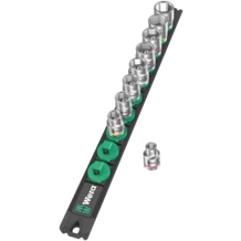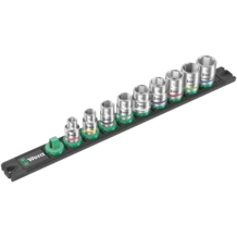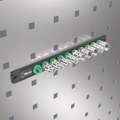 Barre magnétique avec 9 douilles pour l'utilisation manuelle et mécanique (sans chocs), 3/8". Un mécanisme de rotation souple assure un maintien sûr et un retrait facile des douilles. Système Take it easy une couleur en fonction de la taille pour trouver rapidement et facilement l'outil nécessaire. La barre magnétique permet une fixation temporaire sur les surfaces métalliques et la fonction Twist to unlock le maintien et le retrait en toute sécurité des douilles.