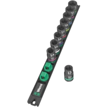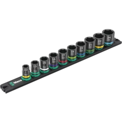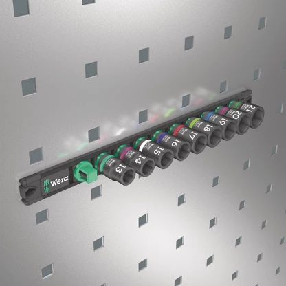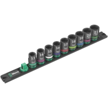Barre magnétique avec 9 douilles Impaktor pour l'utilisation avec les visseuses électriques ou pneumatiques à chocs avec emmanchement de 12,5 mm = 1/2". La technologie Impaktor offre des durées de vie supérieures à la moyenne, même face à des exigences extrêmes. Le profil à six pans utilisé permet la transmission de forces élevées avec une grande précision et préserve le profil. Système Take it easy une couleur en fonction de la taille pour trouver rapidement et facilement l'outil nécessaire. La barre magnétique permet une fixation temporaire sur les surfaces métalliques et la fonction Twist to unlock le maintien et le retrait en toute sécurité des douilles.