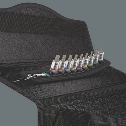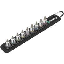 Sangle porte-outils en textile très résistant et design Wera, avec 9 douille-embouts, sur un espace réduit. Le mécanisme "Twist to Unlock", très souple, assure un maintien en toute sécurité et un retrait facile des douilles. Avec le système Take it easy une couleur = une dimension afin de trouver très facilement l'outil nécessaire. Un mousqueton permet la fixation au passant de ceinture ou à une sacoche. Douille-embouts particulièrement courtes et robustes présentant tous les avantages de la technologie Wera. Embout-douille à fonction de retenue pour un vissage simple sans risque de perdre la vis lors du montage. Verso en scratch pour une fixation simple, au mur, à l'étagère, à la servante d'atelier ou au système de transport d'outils Wera 2go.