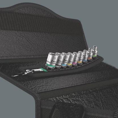 Sangle porte-outils en textile très résistant et design Wera, avec 9 douille-embouts, sur un espace réduit. Le mécanisme "Twist to Unlock", très souple, assure un maintien en toute sécurité et un retrait facile des douilles. Avec le système Take it easy une couleur = une dimension afin de trouver très facilement l'outil nécessaire. Un mousqueton permet la fixation au passant de ceinture ou à une sacoche. Verso en scratch pour une fixation simple, au mur, à l'étagère, à la servante d'atelier ou au système de transport d'outils Wera 2go.