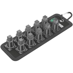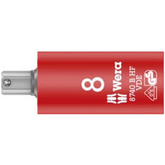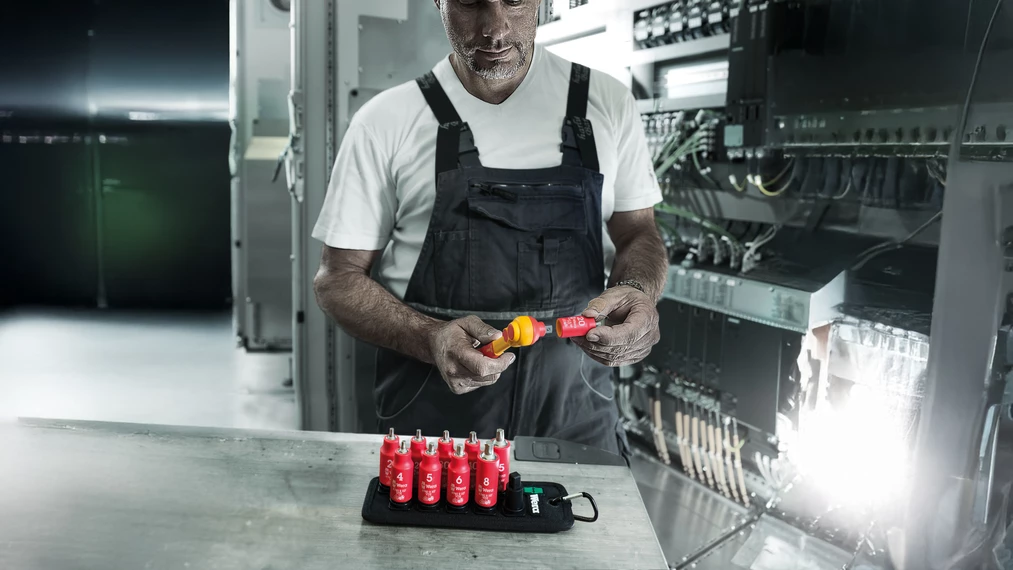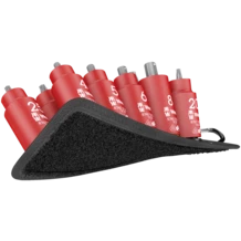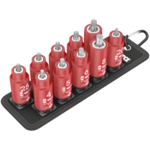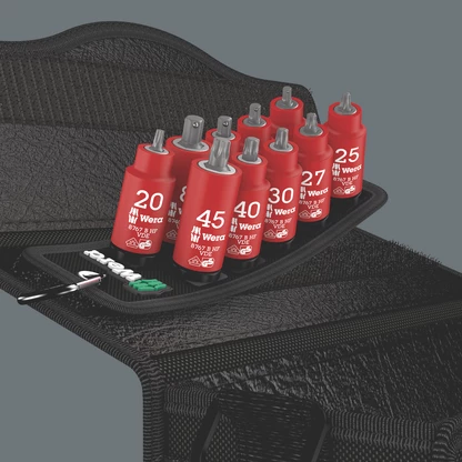 10 douilles Zyklop, carré 3/8", isolées, contrôle unitaire selon IEC 60900. Sécurité renforcé grâce à l'isolant bi-composant et bicolore (jaune intérieur, rouge extérieur), qui rend la couleur jaune visible lorsque l'isolant rouge est endommagé. Avec fonction de retenue pour vis TORX® selon les spécifications Acument Intellectual Properties et 6 pans creux. Sangle textile (Belt) au design Wera avec 10 douilles VDE pour un ensemble compact. Un mécanisme sans contrainte permet le maintien sur et une prise sans effort des douilles. Le mousqueton permet une accroche au passant de ceinture… Arrière en scratch et scratch autocollant pour une fixation simple au mur, à la servante… ou aux produits Wera 2go. Douille VDE 3/8" a fonction de retenue pour réduire le risque de perdre la vis lors de l'approche de la pièce. Sécurité renforcé grâce à l'isolant bi-composant et bicolore (jaune intérieur, rouge extérieur), qui rend la couleur jaune visible lorsque l'isolant rouge est endommagé. Contrôle unitaire selon IEC 60900 sous 10.000 V pour travailler sans risque jusqu'à 1.000 V