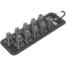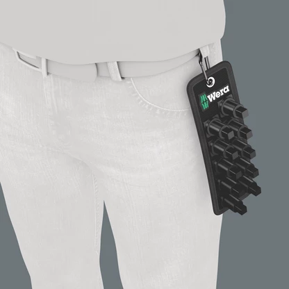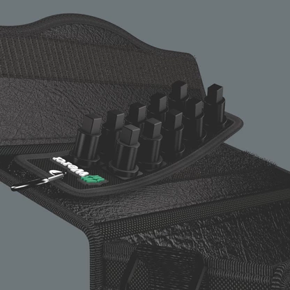 Sangle textile (Belt) au design Wera pour 10 douilles VDE (3/8") et un faible encombrement. Un mécanisme sans contrainte permet de maintenir et prélever les douilles sans effort. Le mousqueton permet une accroche au passant de ceinture… Arrière en scratch et scratch autocollant pour une fixation simple au mur, à la servante… ou aux produits Wera 2go.