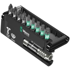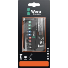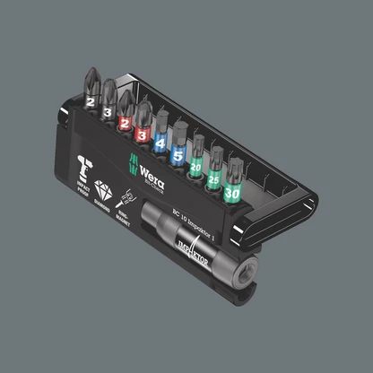 1 porte-embouts Impaktor à jonc d'arrêt et aimant annulaire, 9 embouts Impaktor. Tirant parti à fond des propriétés du matériau et caractérisée par un ajustement géométrique optimal, la technologie Impaktor offre des durées de vie supérieures à la moyenne, même face à des contraintes extrêmes ; particulièrement indiquée pour un emploi sur les visseuses à impact/percussion usuelles. Avec aimant annulaire, pour un maintien aisé des vis longues et lourdes, idéal aussi pour les travaux au-dessus de la tête. Le revêtement diamanté rugueux garnissant la pointe des embouts permet, grâce à une résistance frictionnelle accrue, de réduire le risque de ripage hors de la vis.