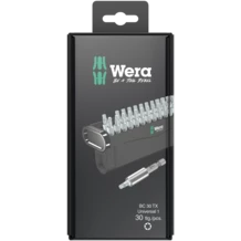 30 pièces. Embouts Wera extra-rigides pour emploi universel. 1 support universel 899/4/1 K utilisable sur visseuse ou porte-mèches de perceuse électronique. Incluant des embouts TORX® extra-rigides, pour emploi universel.