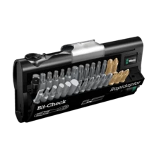 Des embouts et des douilles. Les embouts sont emboîtables directement. Il est possible aussi d’emboîter d’abord un porte-embouts pour guider l’embout. Celui-ci sert alors également de rallonge avec douille de guidage à course libre. Pour les douilles, un adaptateur ¼" hexagonal sur carré est nécessiare, par ex. Wera 870/1 (inclus dans le Bit-Check et les différents mini-cliquets à embouts).