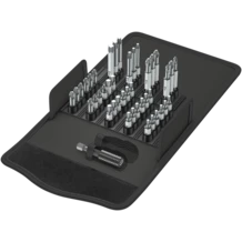 43 pièces. Robuste housse textile contenant des embouts pour emploi universel. 1 porte-embouts universel 899/4/1 avec douille inox, jonc d'arrêt et puissant aimant permanent, pour utilisation sur visseuse ou porte-mèches de perceuse électronique.