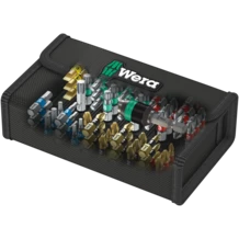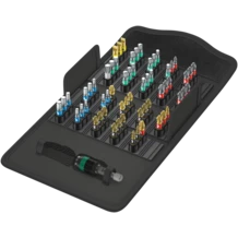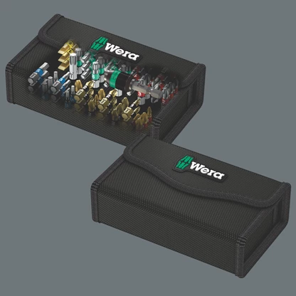 Robuste housse textile contenant embouts et porte-embouts. 61 pièces. 49 embouts BiTorsion pour une haute longévité, en version diamantée (BDC) pour un positionnement sûr dans la vis, extra-rigides (TZ) pour emploi universel, extra-durs (BTH) ; 11 embouts, extra-rigides (Z), pour emploi universel. 1 porte-embouts universel 889/4/1 K avec mandrin à serrage rapide pour utilisation sur visseuse ou porte-mèches de perceuse électronique. Le profil et la taille des embouts sont faciles à identifier grâce au repéreur d'outils Wera Take it easy à codage couleur et marquage bien visible. La housse textile à faible encombrement assure une mobilité élevée à l'utilisateur. Grâce au poids nettement réduit d'un jeu d'outils, le port de la housse est plus agréable. Lorsque la housse textile est déposée, elle n'endommage pas les surfaces fragiles, tout en étant malgré tout incroyablement robuste. Elle supporte même une chute sans que son contenu ou elle-même soient endommagés.