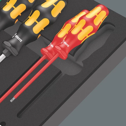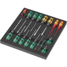 Insert en mousse durable ; bicolore pour repérer rapidement les pièces manquantes ; compatible avec la servante d'atelier Tool Rebel ; équipé de 16 tournevis Wera Kraftform (atelier, VDE, tournevis burins, Micro) et 2 agrippe-vis.