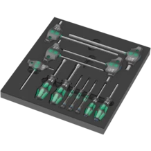 Insert en mousse durable ; bicolore pour repérer rapidement les pièces manquantes ; compatible avec la servante d'atelier Tool Rebel ; équipé de 10 tournevis Wera (atelier, Micro et manche en T) pour vis à six pans creux et 2 tournevis Wera à lame creuse pour vis à tête hexagonale.